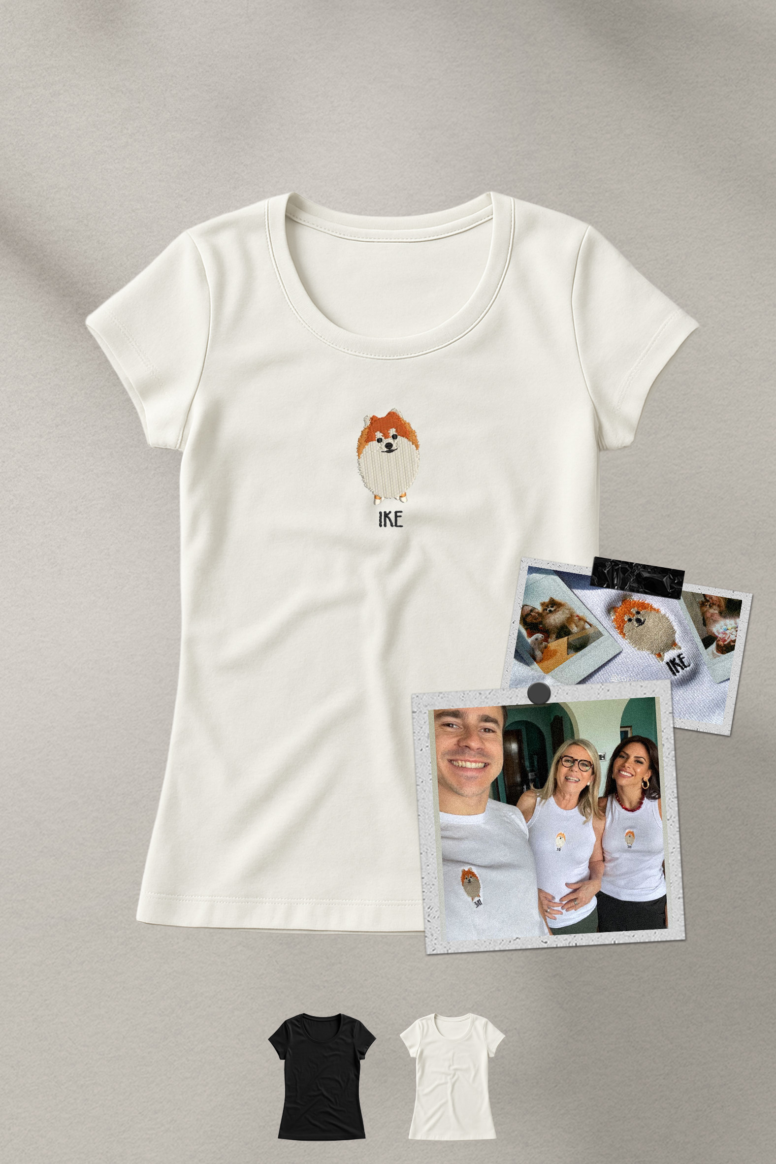 Transformamos suas memórias em bordados de alta fidelidade feitos sob encomenda. Esta baby look é uma homenagem personalizada, criada a partir das suas fotos e histórias, com caimento confortável e toque suave.